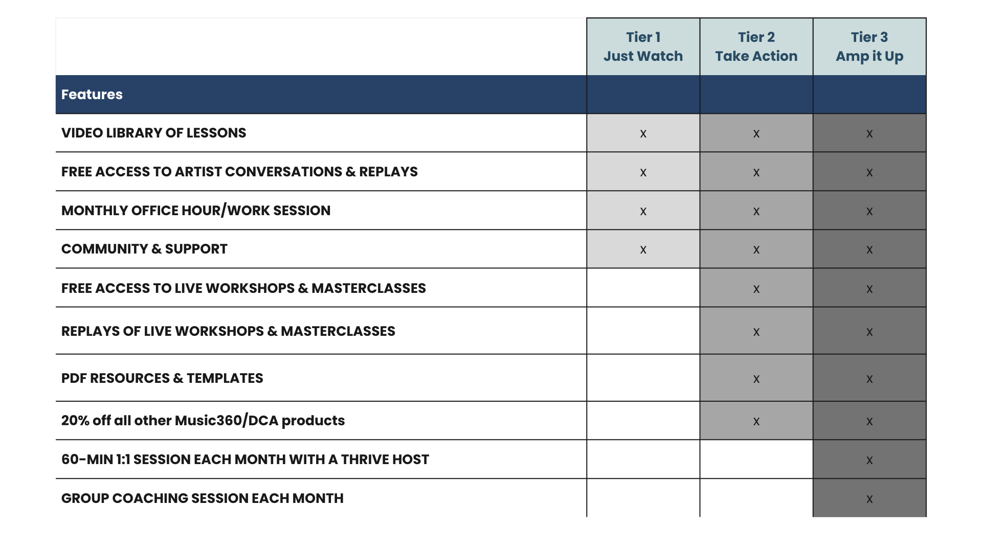 As a Thrive Member, you'll develop the many layers of YOU that are necessary to build a thriving career in music.